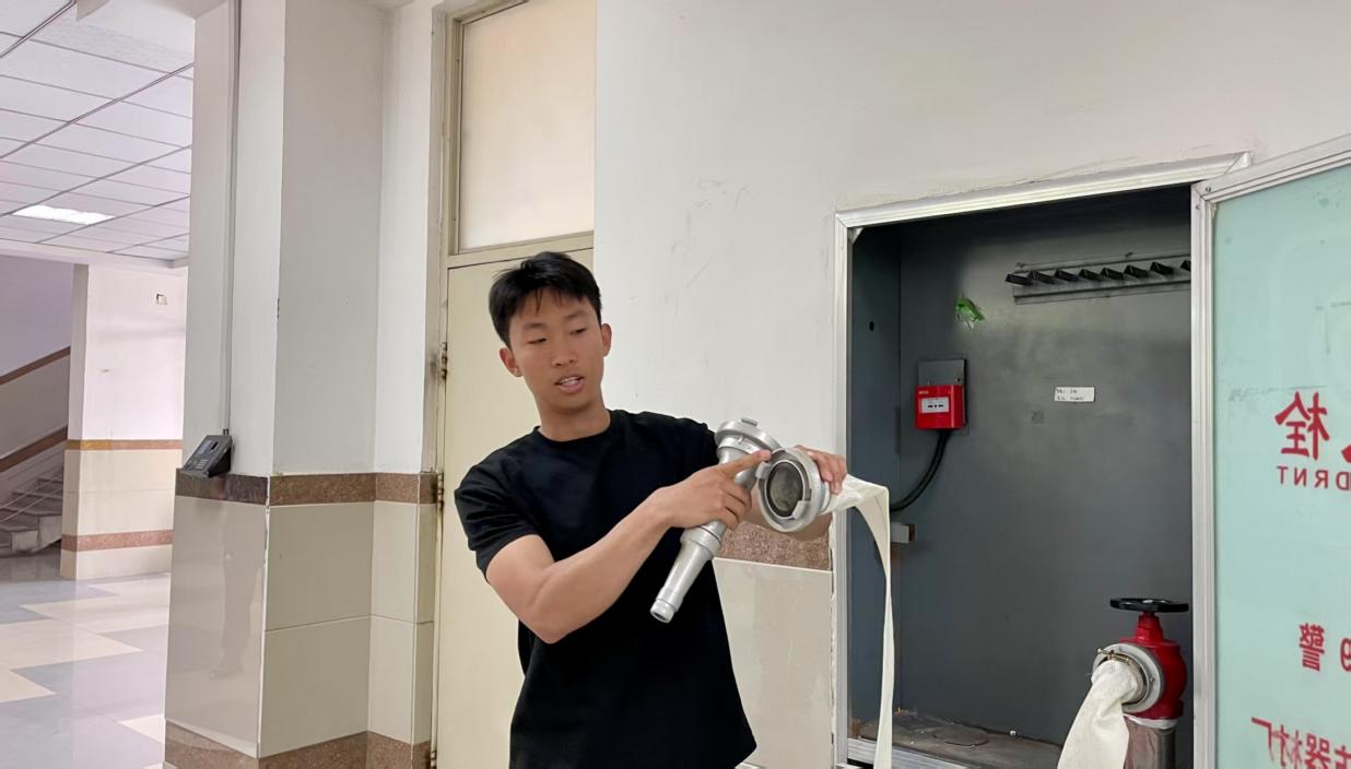 撤离至安全区域后,学前教育专业242班学生李俊达向在场师生详细讲解了干粉灭火器、墙壁消防栓的操作步骤以及在夏季高温环境下的使用注意事项,并进行现场演示,有效提高了学院师生面对火灾时的应急实操能力。