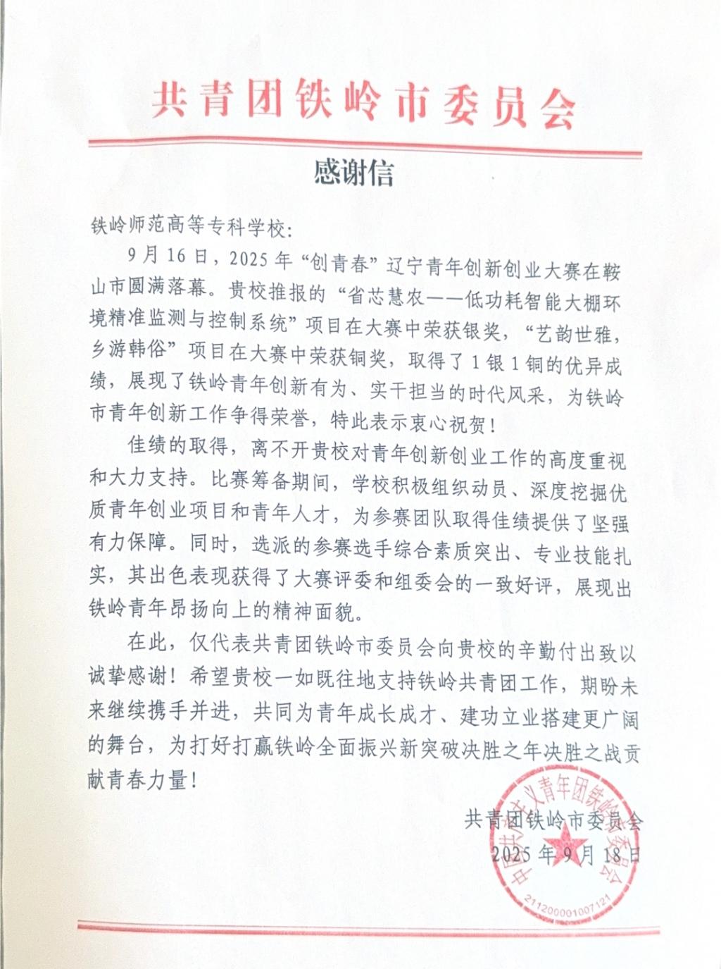 这封感谢信不仅是一份荣誉,更是一份激励。它见证了学校在青年创新创业教育方面取得的阶段性成果,必将鼓舞越来越多的同学积极投身创新创业实践,创造出更多优秀的成果,为学校争光,为铁岭市的发展贡献青春力量!