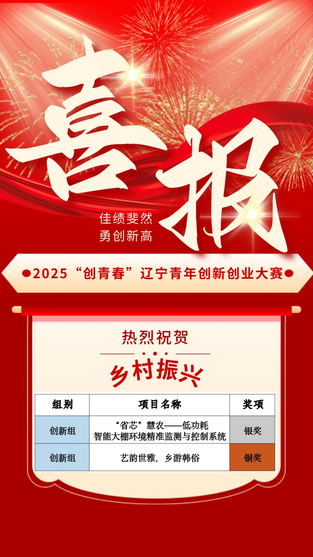 此次获赞,源于学校在2025年“创青春”辽宁青年创新创业大赛中的卓越表现。在这场汇聚了众多优秀青年才俊的大赛里,我校学子凭借扎实的专业知识和创新精神,成功斩获1银1铜的佳绩!其中,“省芯慧农——低功耗智能大棚环境精准监测与控制系统”项目脱颖而出,荣获银奖;“艺韵世雅,乡游韩俗”项目也凭借独特的创意和市场潜力,获得铜奖。