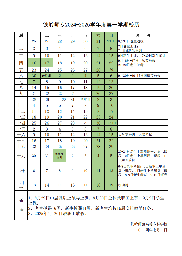 铁岭师专2024-2025学年度第一学期校历